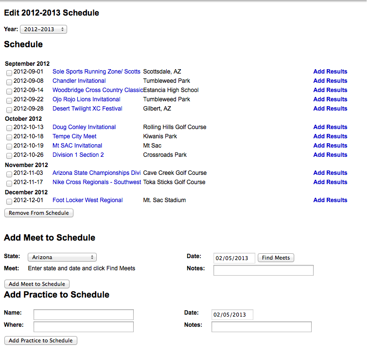 This is the page where all the team results from all the meets show up. The school records are created from this page (if you have a school record from years ago, we can add them to the schedule so your records will be correct).