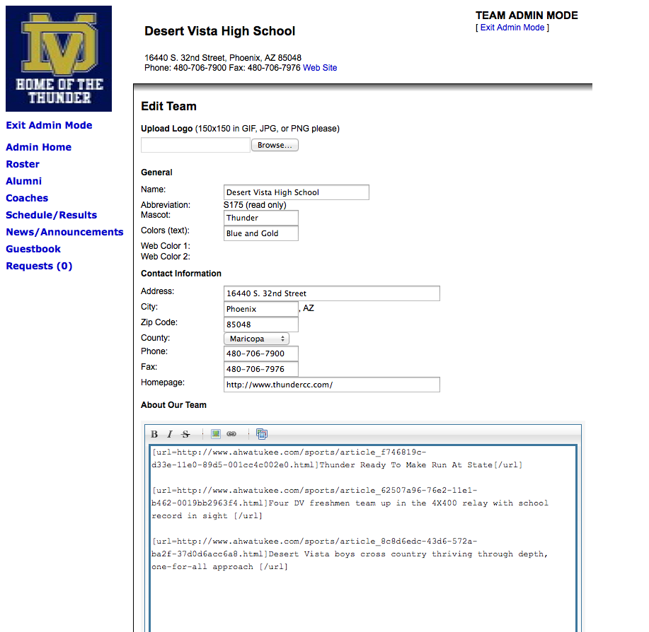 The news and announcement section is a great place to add daily announcements for the team, practice schedules, athlete of the week etc. Just click on the link and add your article.