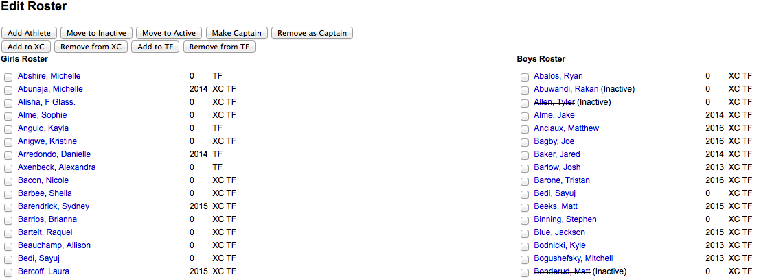 On the left side of the page is a list of links. Click on ”Roster” and you will see a list of athletes with boxes next to their names. Click on the name and correct the spelling and add the graduation year of each athlete. The graduation year is important for 3 major reasons.